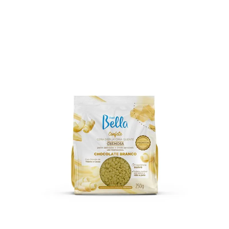 Cera Depilatória Confete Cremosa Chocolate Branco Depil Bella® possui uma textura perfeita, mais cremosa, com ação desodorante e na temperatura certa (baixa fusão), para proporcionar uma depilação suave e confortável. Com uma fórmula inovadora, a Cera Cremosa Chocolate Branco adere melhor aos pelos e não à pele, sendo ideal para as áreas delicadas como: buço, axilas e virilha.