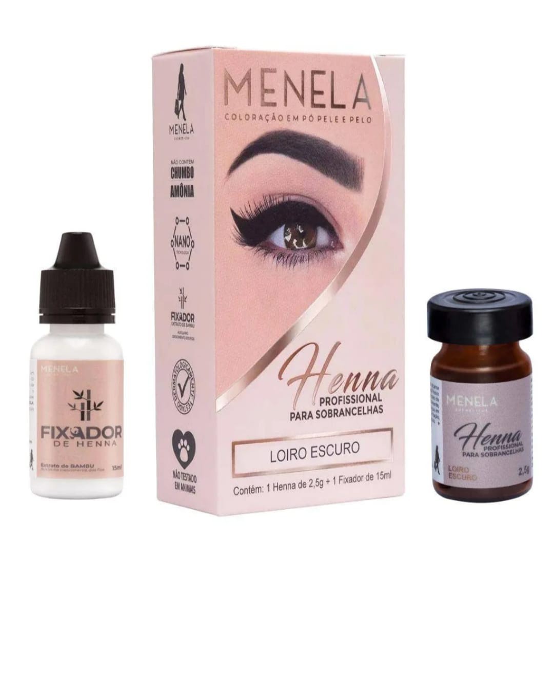 Nossa henna para sobrancelha não contém chumbo, amônia e nem peróxido de hidrogênio (conhecido comercialmente como água oxigenada). A henna MENELA tem em sua composição: extrato da planta Lawsonia inermes (henna), e micro partículas (nanotecnologia).